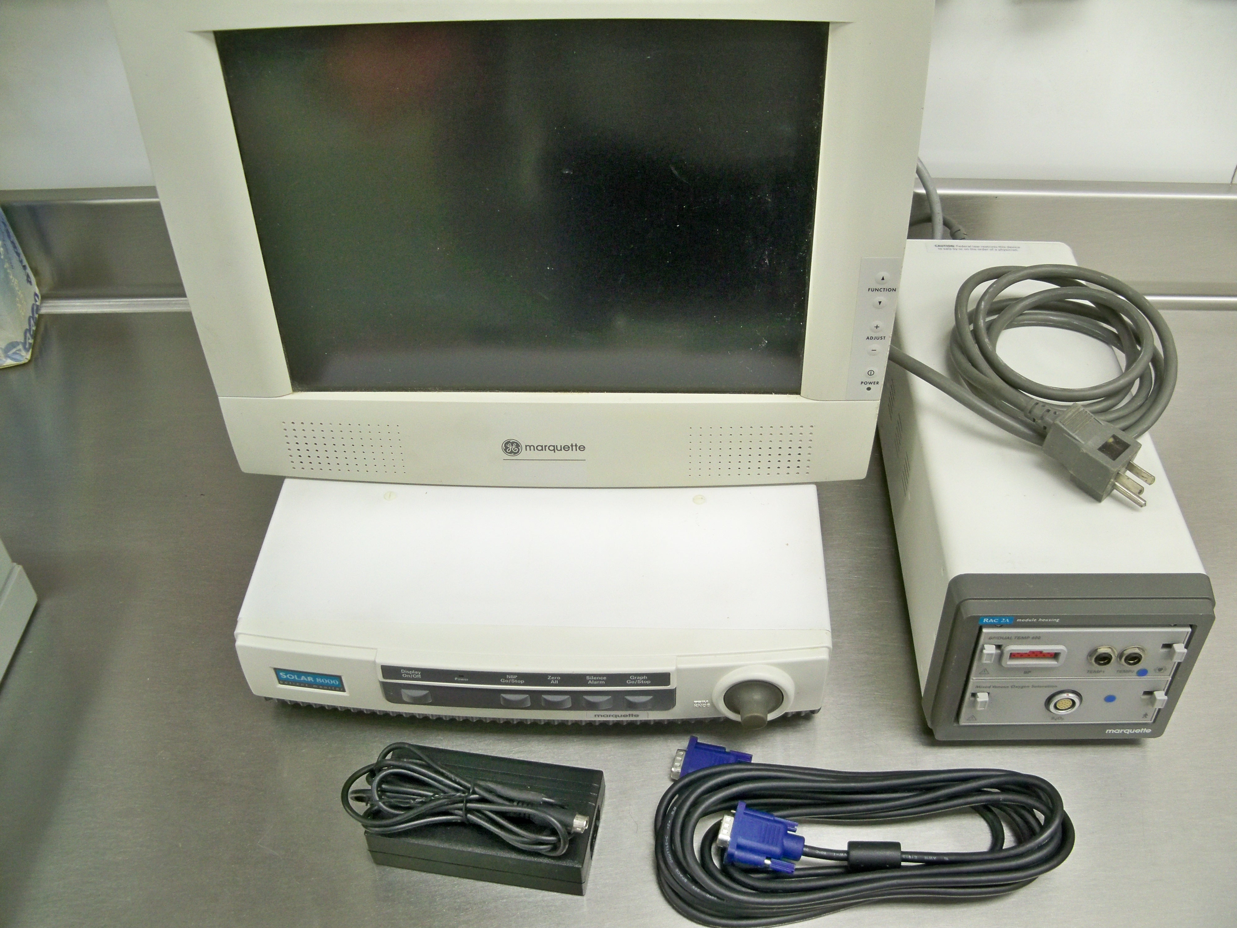 Marquette Solar 8000 patient monitor. This system comes with the system processor, an LCD flat panel display, power supply for the monitor, module housing with an NIPB and dual pressure module, an SVO2 module and power cords. Only thing needed is the data cable between the processor and the module housing. This system is in good condition and has been tested by us to work properly.